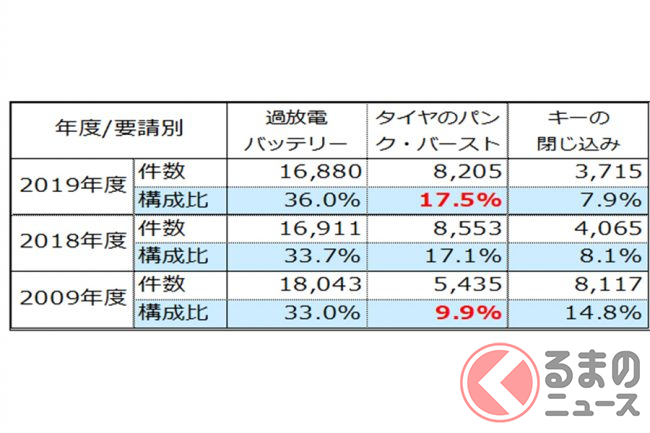 JAFによると2019年度に広島県内で実施されたロードサービス救援要請件数のうち、「タイヤのパンク・バースト」の件数は1万6880件(構成比17.5%)でした。これは、2009年度の5435件(構成比 9.9%)から大幅に増加 する結果です。