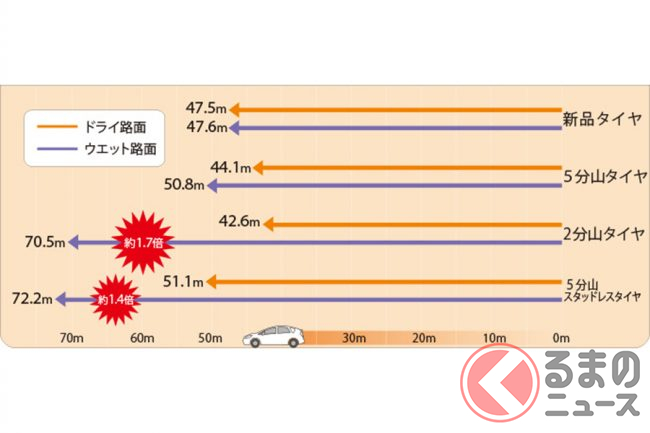 しかし、ウェット路面になると2分山タイヤは、ハイドロプレーン現象でグリップ力が大幅に低下し、ドライ路面の1.7倍の制動距離が必要でした。