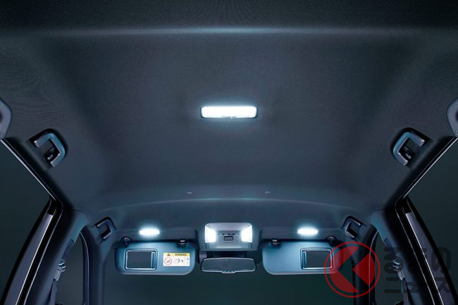 内装のLEDルームランプセットは、レンズ全面がムラなく光るタイプを採用。ベース車のフロントパーソナルランプの色味と調和された暖かみある光が、より広範囲を明るく照らし室内の視認性が向上します。