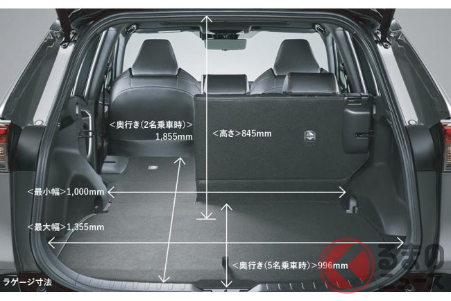 ラゲッジスペースは、大型リチウムイオンバッテリーやスペアタイヤを搭載しても、SUVとして十分の荷室容量490リッターの広さ確保をしました。