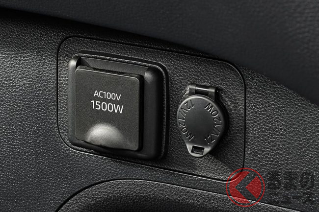 PHVならではの機能として、最大1500W(AC100V)の外部給電機能を標準装備。ラゲッジスペースに設置されたアクセサリーコンセントに加え、付属のヴィークルパワーコネクターを車両後方右側の普通充電インレットに差し込むと、外部給電用のコンセントとして利用することができ、停電や災害時などの緊急時やアウトドアに役立ちます。