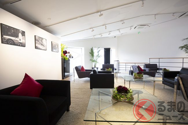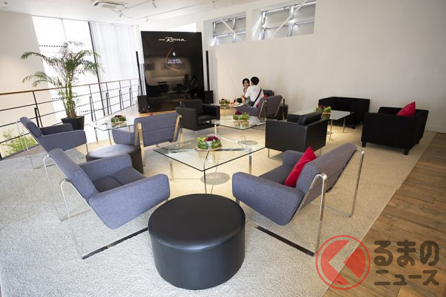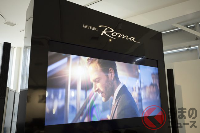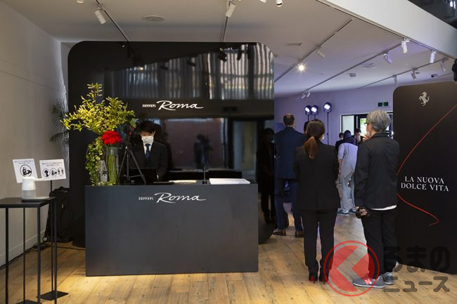 1階では、ローマの街並みのパネルをバックにフェラーリ・ローマが展示され、2階に上がると2台のフェラーリ・ローマが深夜のローマ市街を疾走するショートムービー「La Nouva Dolce Vita」をスクリーンで鑑賞できるラウンジとなっていた。