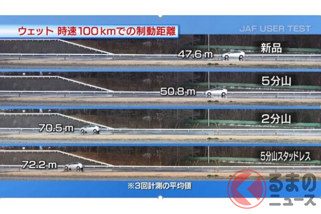 JAFがおこなったユーザーテストで、濡れた路面で時速100kmからフルブレーキをかけた際の制動距離を比較したところ、摩耗タイヤ(2分山)の制動距離は、新品タイヤの1.7倍(47.6m→70.5m)に達し、雨天時における摩耗タイヤの危険性が、改めて明らかになりました。