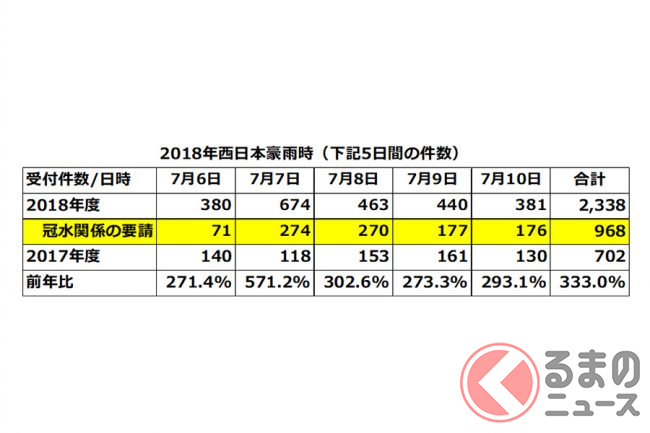 JAFによると、2018年の西日本豪雨時の7月6日から10日(5日間)の広島県内の救援要請は2338件。これは前年同期間の約300%と非常に多く、そのうち冠水に関わる要請は968件と大雨の影響で多くの車両トラブルが発生したことがわかっています。