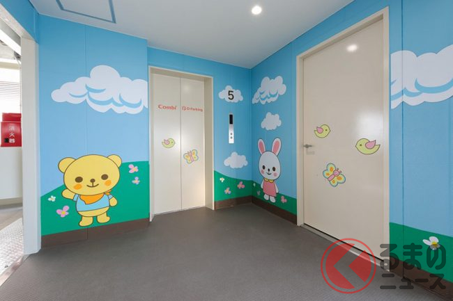 また、赤ちゃんや小さな子どもが目に触れる空間として、デザインにもこだわりを持っています。エレベーター前には、コンビのキャラクター「くまくん」「うさちゃん」がプリントされているほか、駐車場スペース内には動物の足跡ラインがペイントしてあります。