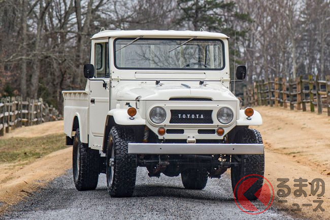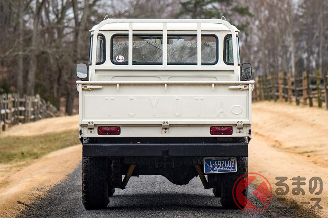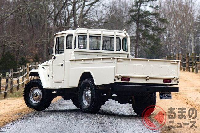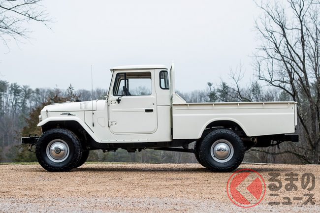 今や世界的な人気モデルとなり、邦貨換算で1000万円にもおよぶ落札さえ見られることもあるランドクルーザー40系だが、この時出品された車両はもとより希少なピックアップトラック型ボディの「FJ45」に、より新しい世代のGM製5.7リッター「ラムジェットV8」エンジンをコンバートした、いわゆる「レストモッド」車両であった。