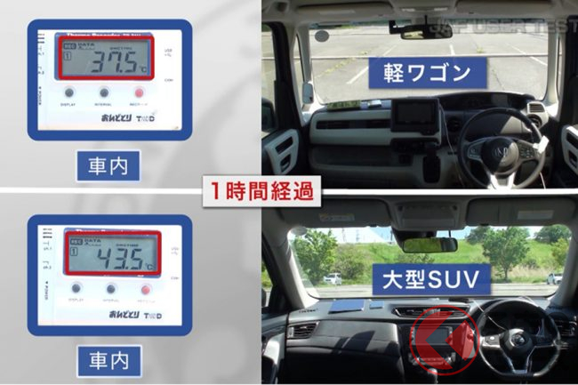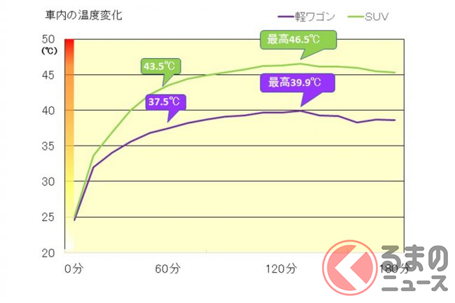 JAFが実施した車内温度の検証テストによると、外気温が約23度から25度/車内温度約27度の状況でも、開始から1時間の間に車内温度は約37度から44度まで上昇。