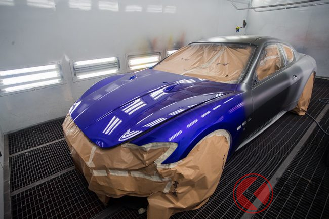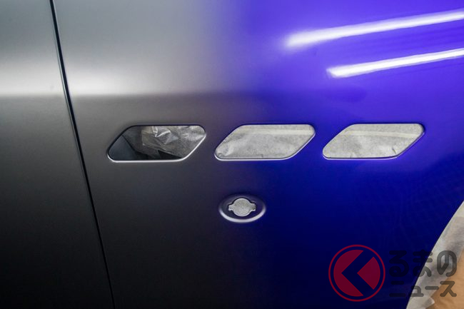 それに合わせるかのように、ブルーへとミッドセクションでゆるやかに色が変化していき、フロントノーズに向かうにつれマセラティブルーへと深化。