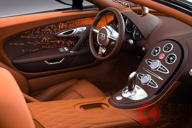 インテリアも同様に、ドアトリムには数式が描かれている。これも当初はスプレーによるグラデーションをヴェネ氏は希望したが、ブガッティのブランド・イメージには合わないということで、このような仕様になったとのこと。結果的にはこちらの方が芸術的ではある。