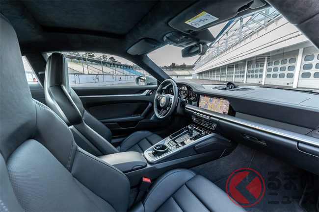 ボディスタイルは初代から継承するフラットなフロントフードから鋭く立ち上がるフロントウィンドウ、そしてリアに向かって流れるようなルーフライン、最新のLEDテクノロジーを採用した丸型ヘッドライトなど、ひと目で911とわかるシルエットです。