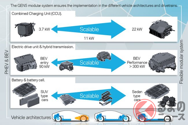 電気モーターやパワーエレクトロニクス、トランスミッションを中央のハウジングに配置し、最新のバッテリーセルをフロアに敷き詰めることで、室内と荷室スペースを最大限確保できるようになった。