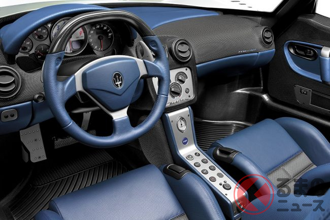 MC12の内装は、意外にも豪華なフィニッシュだ。ボディカラーとコーディネイトされたブルーレザーを積極的に採用するほか、現代のロードモデルには必要不可欠なエアコンも標準装備。シートはスパルコ製のバケットタイプで、シリアルプレートにはカスタマーの名前までもが刻印されるなど、その趣味性は高かった。