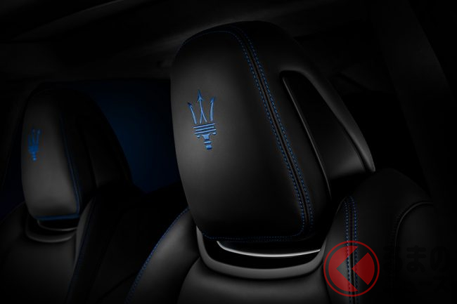 エクステリアに用いられるブルーは、マセラティらしく上品に差し色として使われている。フロント左右のフェンダーに穿たれた3つのエアインテーク、ブレーキキャリパー、そしてCピラーに取り付けられたトライデントのバッジにブルーが用いられている。