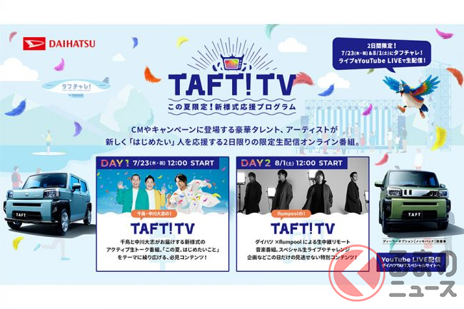 ダイハツは2020年6月10日に、新型軽SUV「タフト」を発売。それに伴って7月20日より、中川大志さん、千鳥さん(声)出演の新CM「ジブンオープン篇」を公開すると同時に、みんなの「はじめたい」を応援するキャンペーン「#タフチャレ!キャンペーン」をスタートすると発表しました。