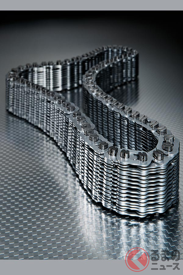 具体的にいえば、ベルトの断面は、内側(下側)が狭く、外側(上側)が広くなっている。そのベルトを内側が円錐形になったプーリーが挟む。プーリーは油圧によってベルトを挟む幅を変化させるのだ。