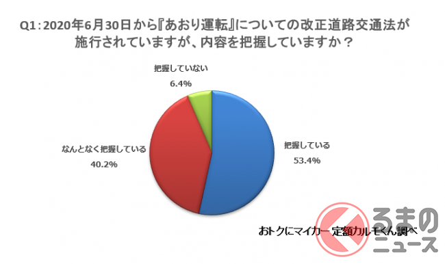 まず、2020年6月30日に施行された改正道路交通法について、内容を把握しているかどうかを聞いたところ、「把握している」と答えた人が53.4%(763人)、「なんとなく把握している」と答えた人が40.2%(574人)となっており、合計で90%を超える人が施行された事実を知っているという結果となりました。