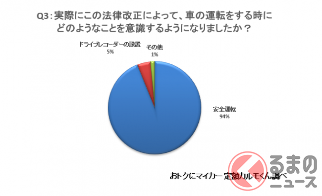 また、把握しているや、なんとなく把握していると答えた1337人に、 この法律改正により、クルマの運転をするにあたっての意識は変わったかどうかを聞いたところ、50.8%(679人)が「意識が変わった」と回答。実際にどのようなことを意識するようになったかという質問には、94%が「安全運転」、5%が「ドライブレコーダーの設置」と回答しています。
