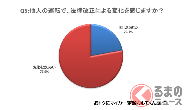さらに、改正道路交通法の内容について、把握しているや、なんとなく把握していると答えた人1337人に、6月30日以降、他人の運転で法律改正による変化を感じるかどうかを聞いたところ、 22.1%(296人)が「変化を感じる」と回答。