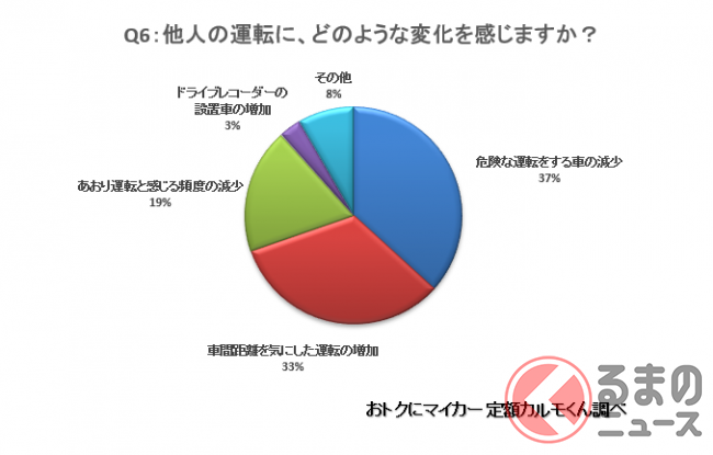 また、「車間距離を気にした運転の増加」と答えた人は全体の33%で、「前後のクルマなどが、車間距離を以前より意識している感じがする」や、「以前はあおられていると感じることが多かったが、車間距離をあけてくれるクルマが増えたと感じる」などと回答。