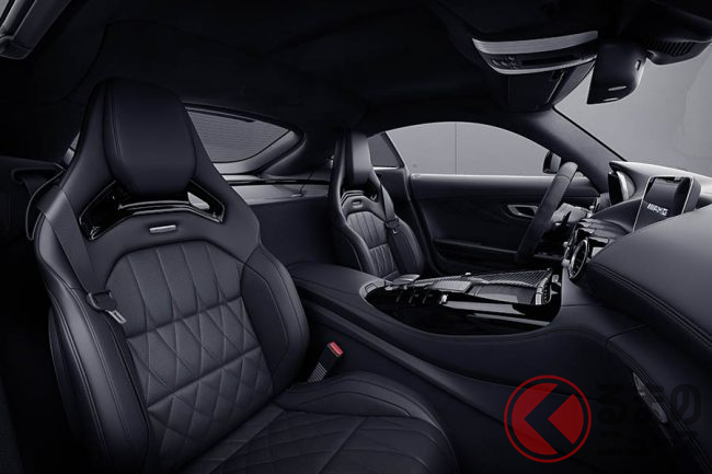 AMGパフォーマンスシート、AMGインテリアナイトパッケージ、ブラックのステアリングホイールスポークとシフトパドルを備えたDINAMICAマイクロファイバー製AMGステアリングホイール、ダイヤモンドキルティングとブラックのトップステッチを施したブラックのエクスクルーシブナッパースタイルレザー、ブラックピアノラッカーのトリムエレメント(オプションでカーボンファイバー/ブラックピアノラッカー)を装備。センターコンソールのバッジは、この特別なモデルを象徴するものとなっている。