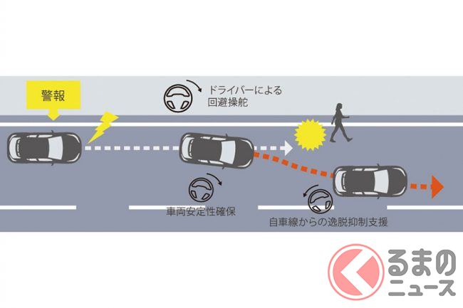 この機能は、自車線内の歩行者と衝突する可能性が高く、自車線内に回避するための十分なスペースがあるとシステムが判断した場合で、ドライバーの回避操舵をきっかけに車線内で操舵をアシストし、車両安定性確保と車線逸脱抑制に寄与します。
