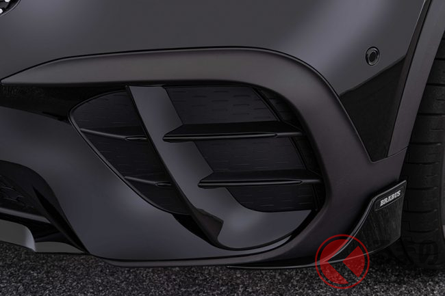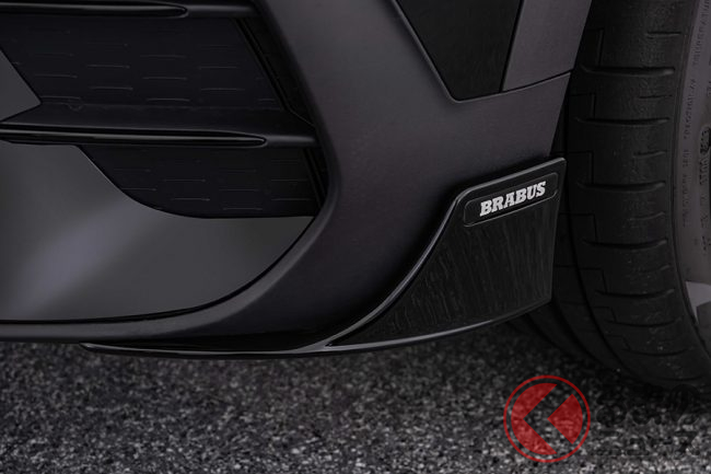 その下のフロント・バンパースポイラーも、ボトムのエアインテークなどでは独自の造形が認められる。サイドのコンパクトなカナードにブラバスのロゴが描かれているのも、オーナーにはとりわけ粋に感じる演出といえるだろう。