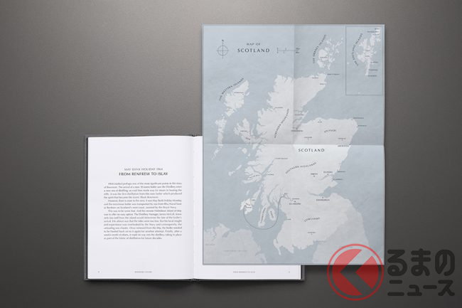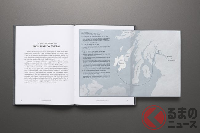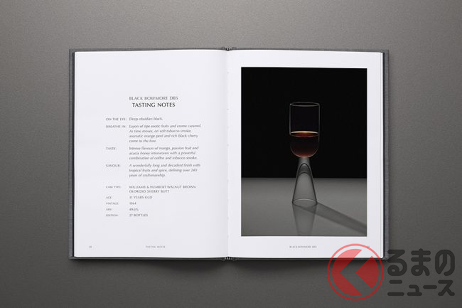 ボックスは、ボウモアの蒸留所が建つアイラ島の海にインスパイアされた、深いブルーと波をイメージしたエンボス加工が施されている。素材には最高級のカーフスキンを使用し、特注の真鍮製の留め金や蝶番はニッケルメッキが施され、DB5を彷彿とさせるデザインとなっている。