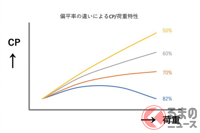 これが、荷重が増えてもそれに比例してCPも増える低偏平タイヤのメリットだ。