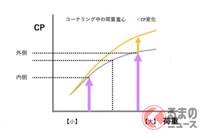 直進時に一定スピードで走っていれば、左右のタイヤに掛かる荷重は1輪あたり100%のままだ。カーブになって重心が遠心力で外側に引っ張られると荷重は外側のタイヤに多くかかり、その分内側のタイヤは少なくなる。極端に表すと、外側150%、内側50%になったとする。外側のタイヤが大きな荷重を負担しなくてはならないが、そこで荷重が大きくなってもCPが比例して大きくなれば、左右のタイヤの合計のCPは低下しないことになる。