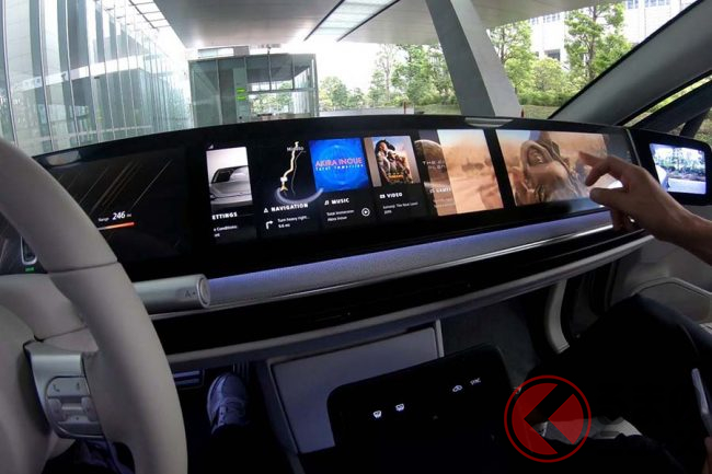 車内に入ると、乗員を取り囲むようにダッシュボード全体に「パノラミックスクリーン」と呼ばれるディスプレイが広がっている。じつはこの発想もOVALのコンセプトから生まれており、天井を見上げれば陽光が降り注ぐガラスルーフが広がる。