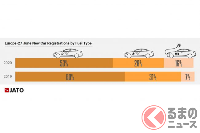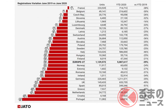 自動車産業の世界的な調査会社であるJATOジャパンが、2020年6月の欧州新車販売台数速報を公開しました。