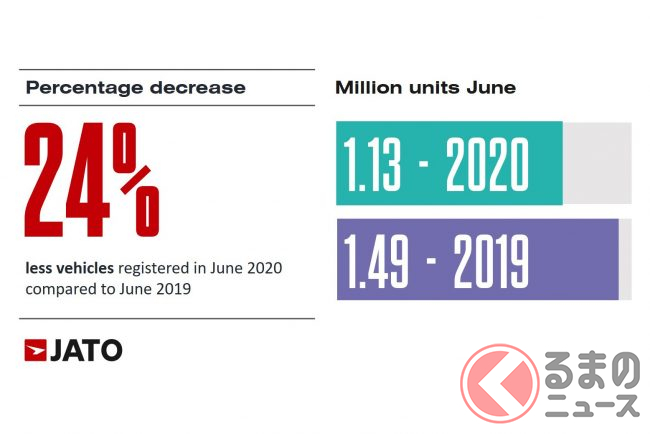 JATO Dynamicsのデータによれば、2020年6月の欧州新車販売台数は113万台で、2019年6月の149万台から24%減となりました。
