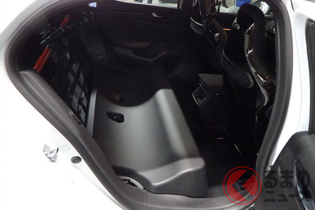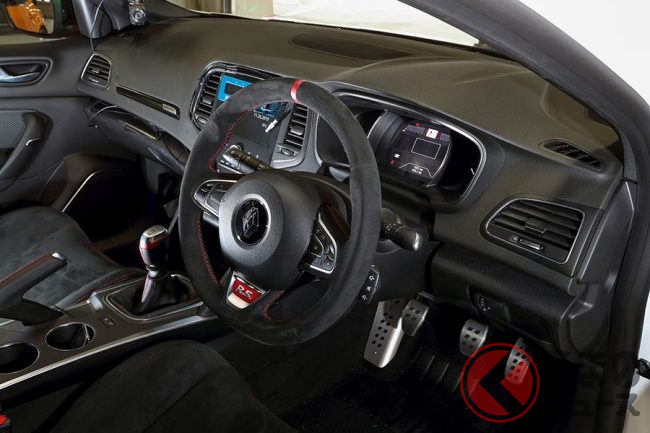 メガーヌR.S.トロフィーRがR.S.トロフィーと異なるのは、その徹底した軽量化だ。リアシートを配し2シーターとしたり、デュアルクラッチ6速EDCを6速MTに変更したりと多岐にわたり、結果としてトータル130kgの軽量化を実現している。