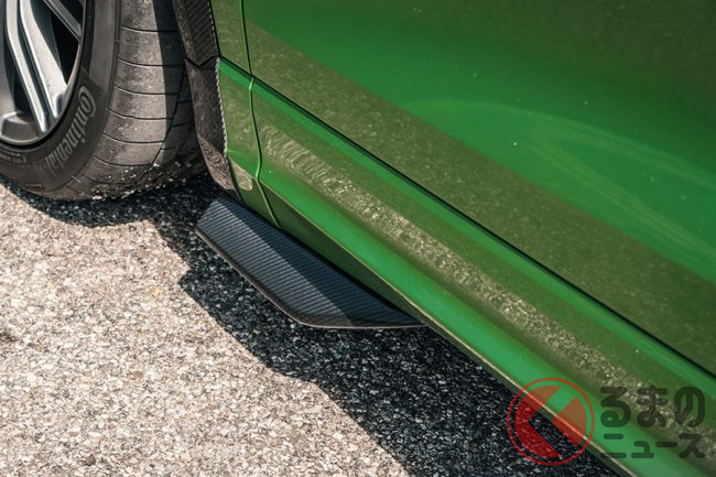 実際に装着されているアドオン・パーツは、「フロントスカート」、「フロントリップ」、「サイドスカート」、「ミラーキャップ」、「フェンダーエクステンション」、「リアスカート」、「リアスポイラー」などで、それらはすべて軽量なカーボン素材で成型されている。