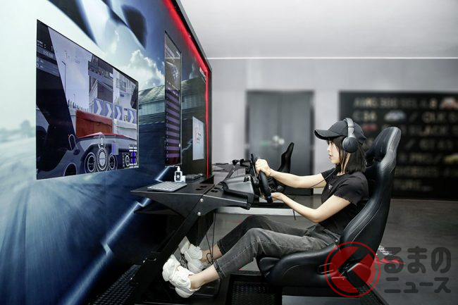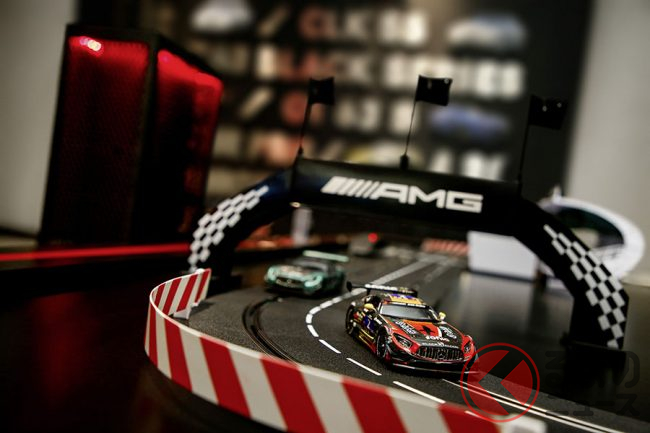 階段を上っていくと体験ゾーンへと続く。ここではレーシングシミュレーターやARアプリケーションを体験することができ、また脳波で制御されたスロットカーのレーストラックもテクノロジーのハイライトとなる。