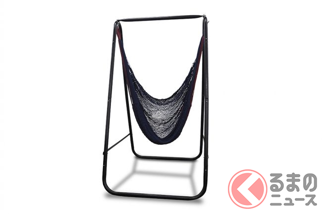 限定車にマッチするブルーを基調とした手編みのハンモックは、デイキャンプなどで重宝するアイテムだ。