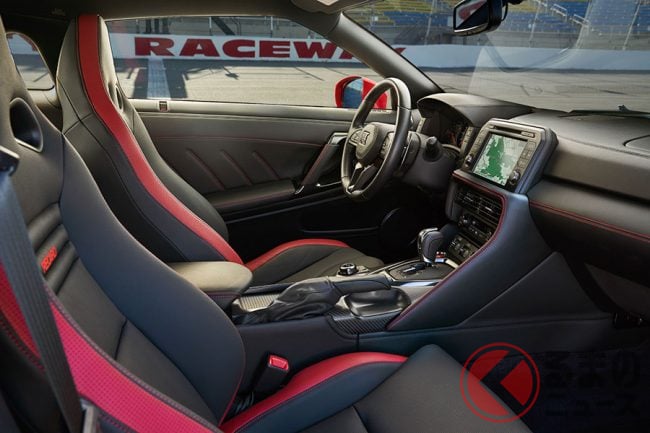 室内は、GT-R NISMO専用の赤いスエードの組み込まれた本革製レカロシートを採用。