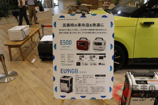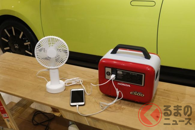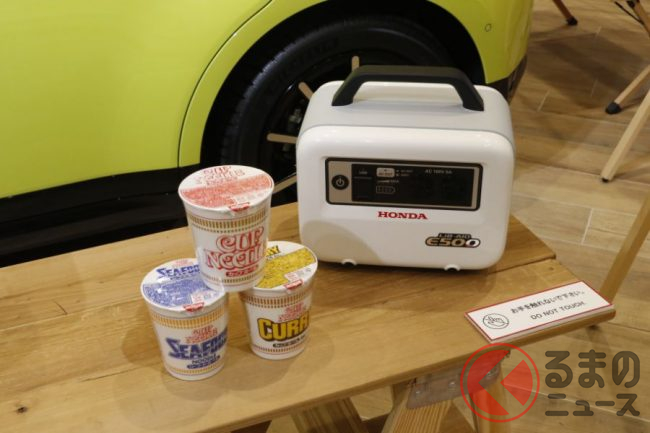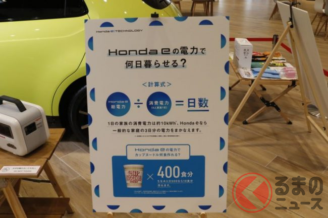 なお、満充電時のホンダeでは家族4人の場合、3日分の電力をまかなえるといい、これを日清の「カップヌードル」で換算すると400食分になるといいます。