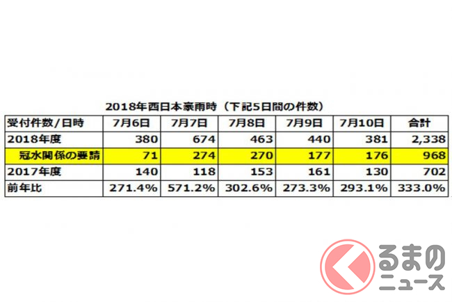 JAFによると、2018年の西日本豪雨が起きた2018年7月6日から10日(5日間)の広島県内の救援要請は2338件。前年同期間と比べて約333%と非常に多く、そのうち冠水に関わる要請は968件で、大雨の影響で多くのトラブルが発生したことがわかっています。