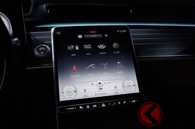 センターコンソールにある新しい有機ELディスプレイのサイズは239.06mm×218.8mmで、アクティブスクリーンの対角線は12.8インチ。画面面積は先代モデルより64%拡大している。またMBUX(Mercedes-Benz User Experience)の演算能力は、先代モデルのシステムと比較して50%向上、「ハイ!メルセデス」は27の言語に対応するという。