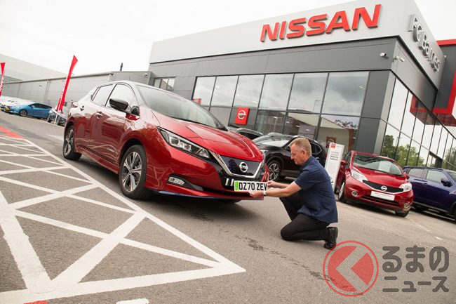 ユーザーに対して、グリーンナンバープレートが装着されたクルマがどのように見えるのか、日産イギリス法人は自社の電気自動車「リーフ」を使って販売店でユーザーに見せる施策をおこなっていると、2020年8月28日に発表しました。