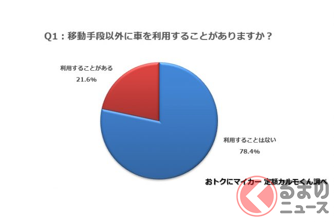 まず、移動手段以外にクルマを利用することがあるかどうかを聞いたところ、78.4%の1133人が「利用することはない」と回答。「利用することがある」と回答したのは21.6%の313人でした。