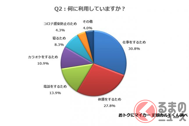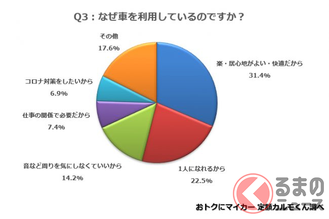 「コロナ対策をしたいから」と回答した6.9%には、「クルマのなかは他の場所より安全だから」や「他の休憩室より密を防げるから」などの回答も目立つ結果です。