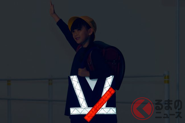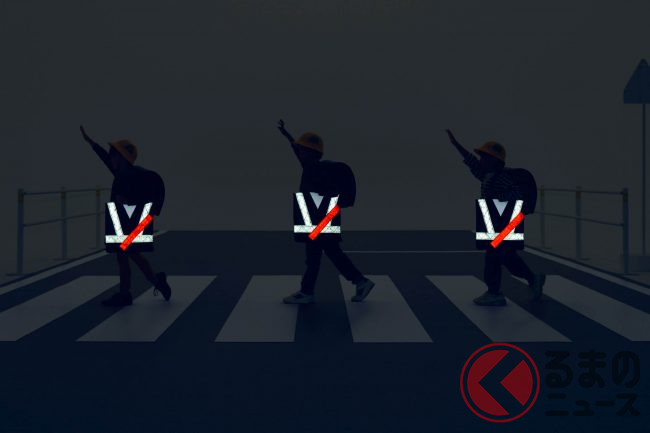 夕暮れ以降の事故の防止効果を高める対策のひとつとして、クルマのライトが当たると光り、ドライバーの視認性があがる、反射材を身に着ける方法が推奨されています。