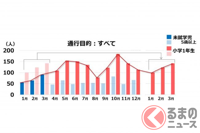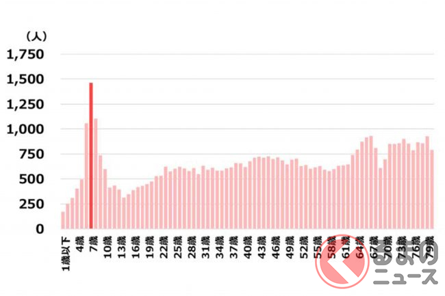 歩行中の交通事故死傷者数を年齢別でみると、7歳が突出して多くなっています。