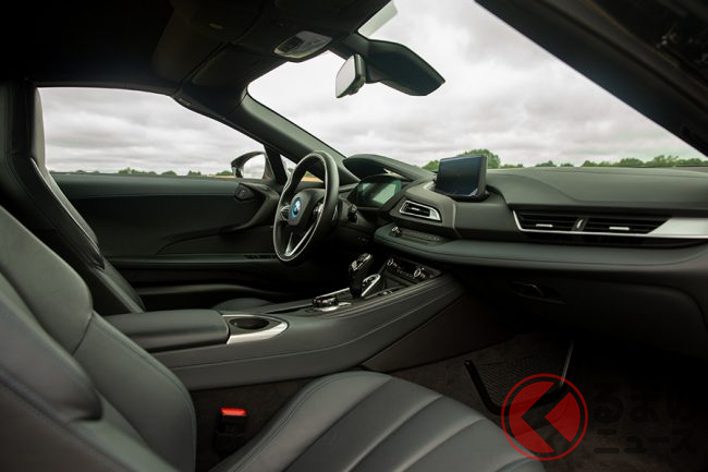 ロードスターの最大の魅力は、やはり電動ソフトトップによるフルオープン機構だろう。そもそも未来的な感覚でまとめられたi8のボディだが、さらにトップが全自動で開閉することで、見る者の目はそれに引きつけられる。
