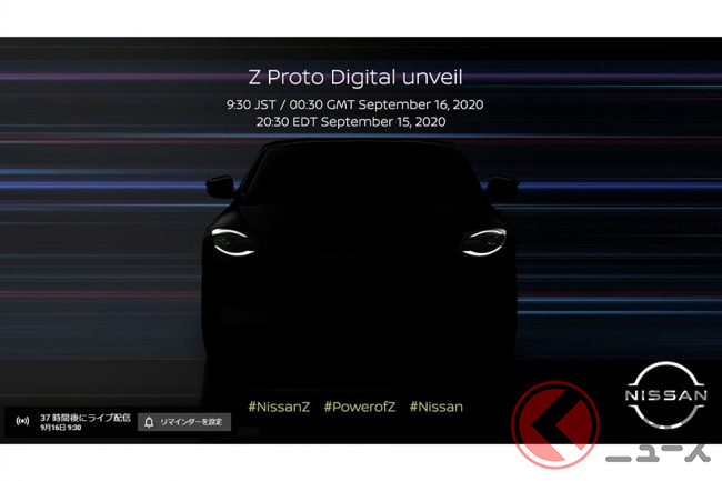 日産は、2020年9月16日に世界初公開する新型「フェアレディZ」のフロントマスクのシルエットを、YouTube上で公開しました。