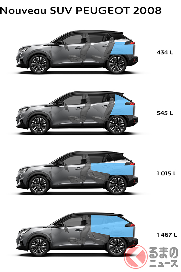 荷室容量は、クラス最大級の434リッターを確保。可動式のフロアボードを備え、荷室を上下に区切ることができる。60:40の分割可倒式のリアシートバックを倒せば最大1467リッターの空間が出現する。これは従来型2008より通常時プラス74リッター、最大時プラス295リッターもの拡大となっている。
