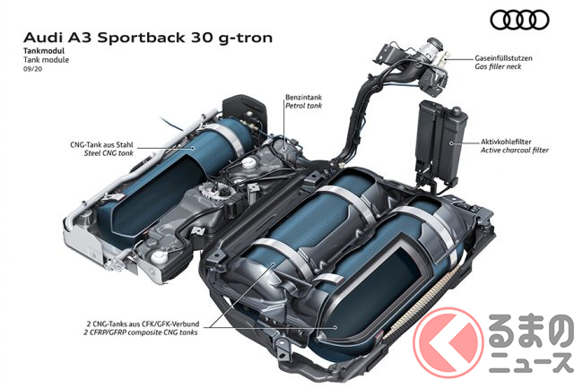 今回登場したアウディA3スポーツバック 30 g-トロンは、燃料に天然ガスまたはバイオメタンを使用する天然ガス車(CNG車)。2014年に初代A3スポーツバック g-トロンが登場、今回は2代目となる。