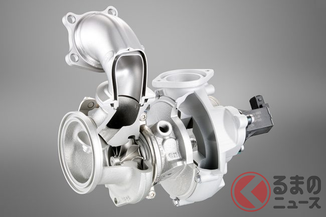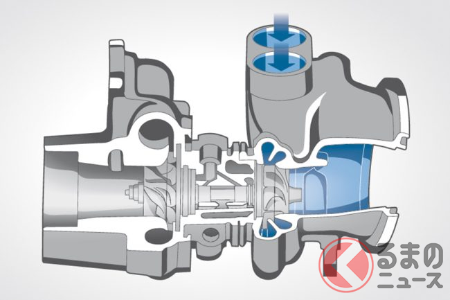 そこで考えられたのが、エンジンが排出している排気ガスの力を利用してコンプレッサーを駆動する、ターボチャージャーというシステムだった。これは、それまでは無駄に捨てられていた排気ガスのエネルギーを利用してコンプレッサーを動かすため、エンジンの動力に対してほとんど影響なく過給をおこなうことができる。